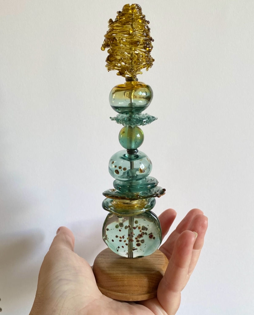 As the River Alde ebbs and flows through the reeds, layers of subtle colour and texture are revealed then concealed by the tide. Riverbank totem of flame-sculpted, blown and stacked glass elements, in Gallery 21 (& The Dovecote) with the Suffolk Craft Society in partnership with Britten Pears Arts at Snape Maltings.